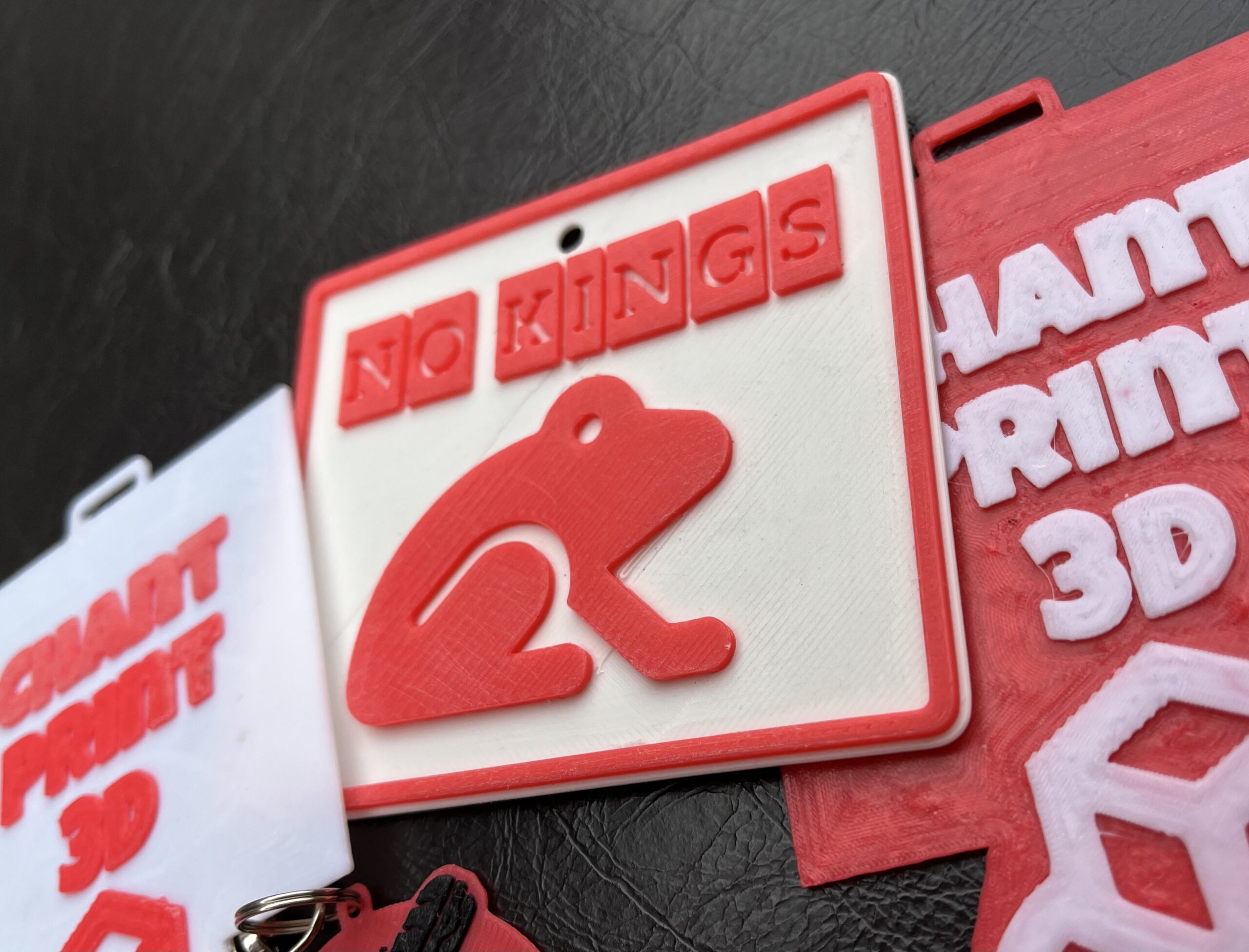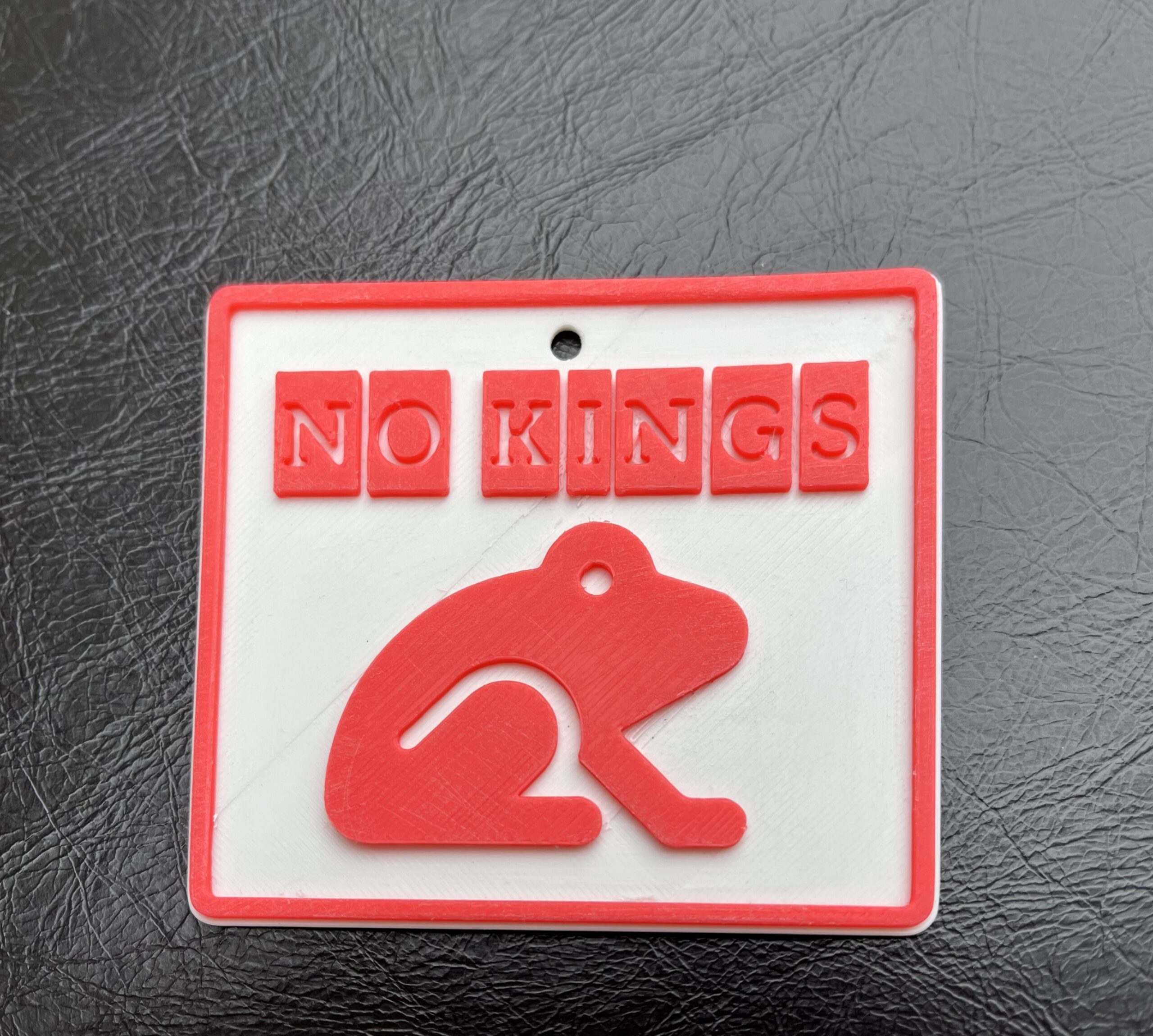 No Kings will be 3d-printed with attention to detail and an eye towards art. Each piece includes your choice of backing — a magnet or a built-in hanging slot — so you can display it wherever you like. The main material is PLA, which is biodegradable (in most conditions) and will work for years in regular indoor environments. Contact us to create the medallion with materials that will survive longer outside.