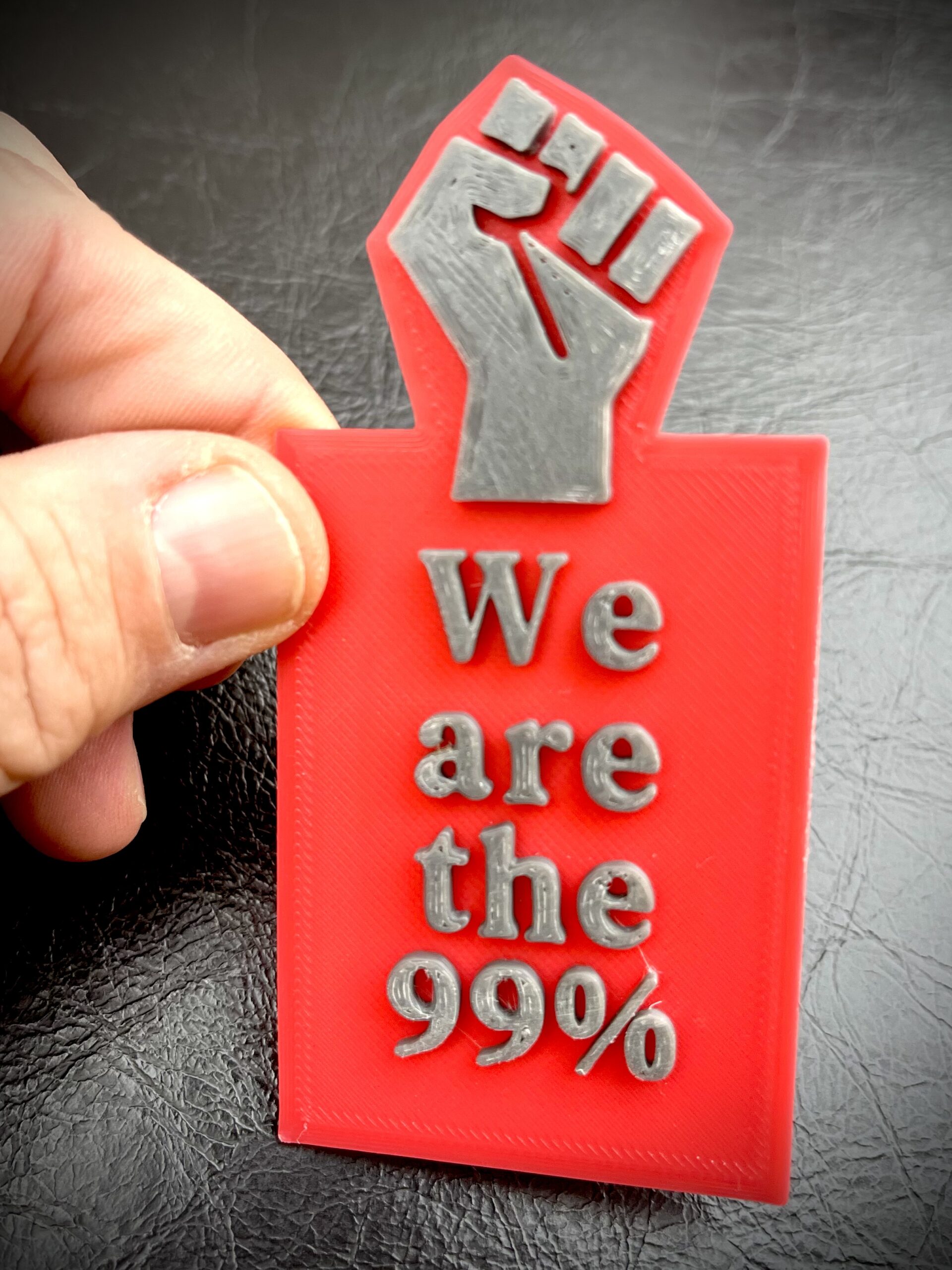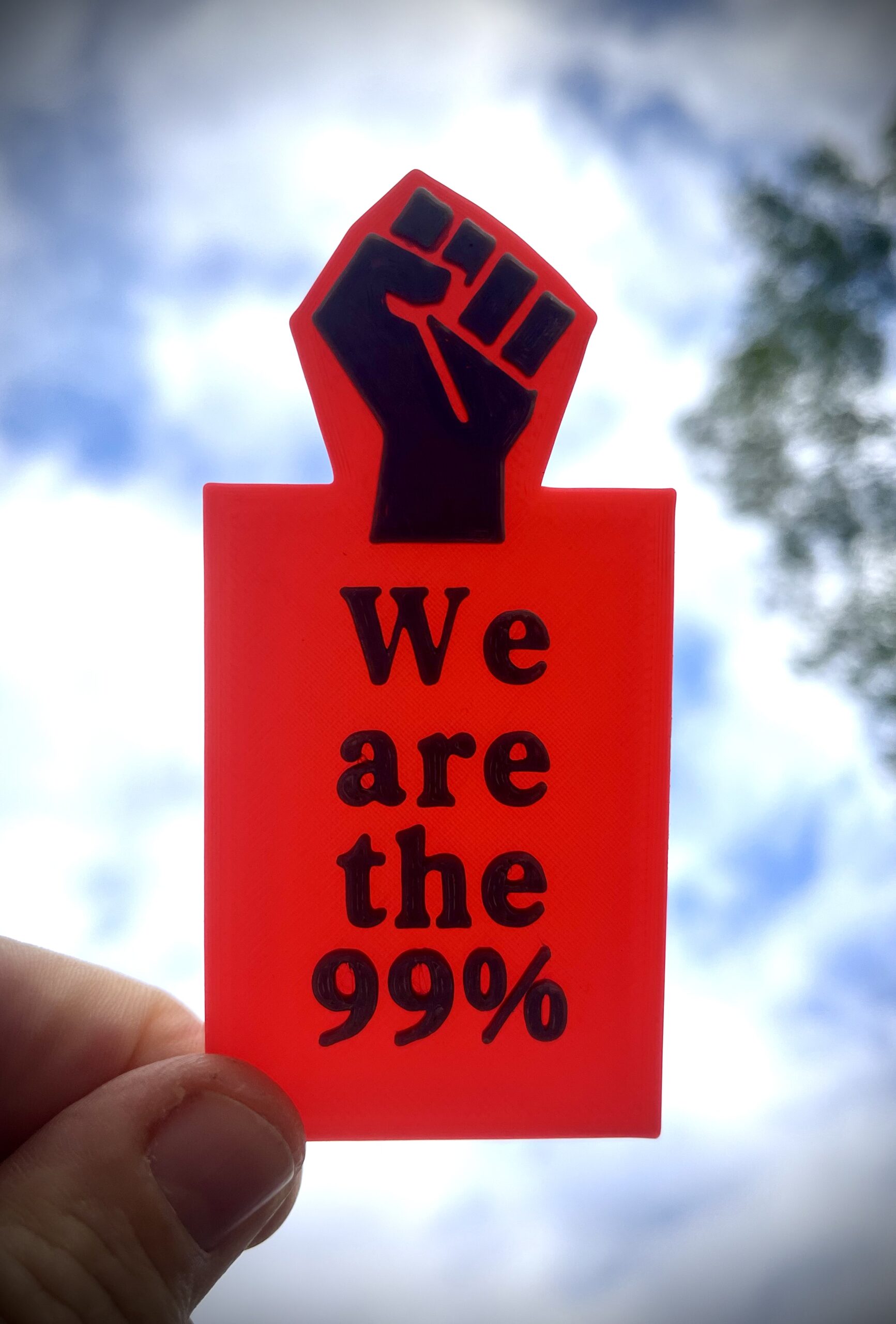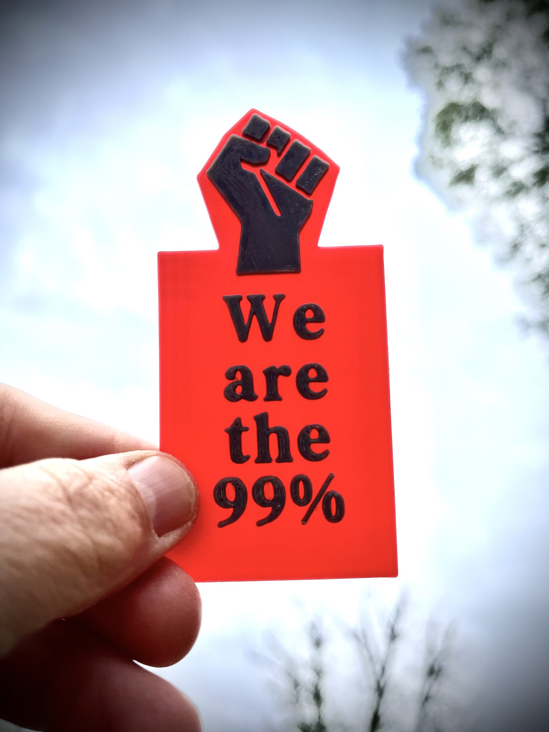 We are the 99% will be 3d-printed with attention to detail and an eye towards art. Each piece includes your choice of backing — a magnet or a built-in hanging slot — so you can display it wherever you like. The main material is PLA, which is biodegradable (in most conditions) and will work for years in regular indoor environments. Contact us to create the medallion with materials that will survive longer outside.
