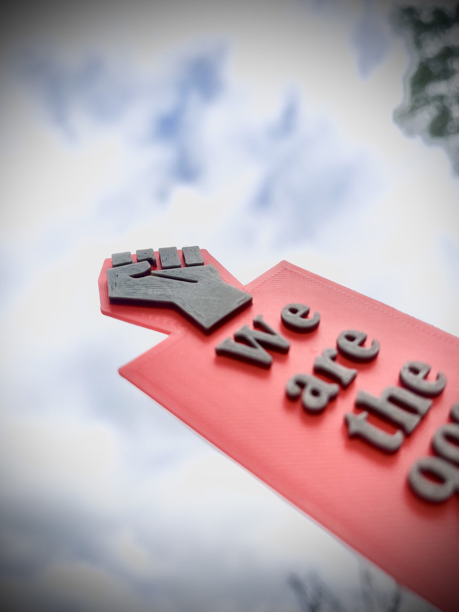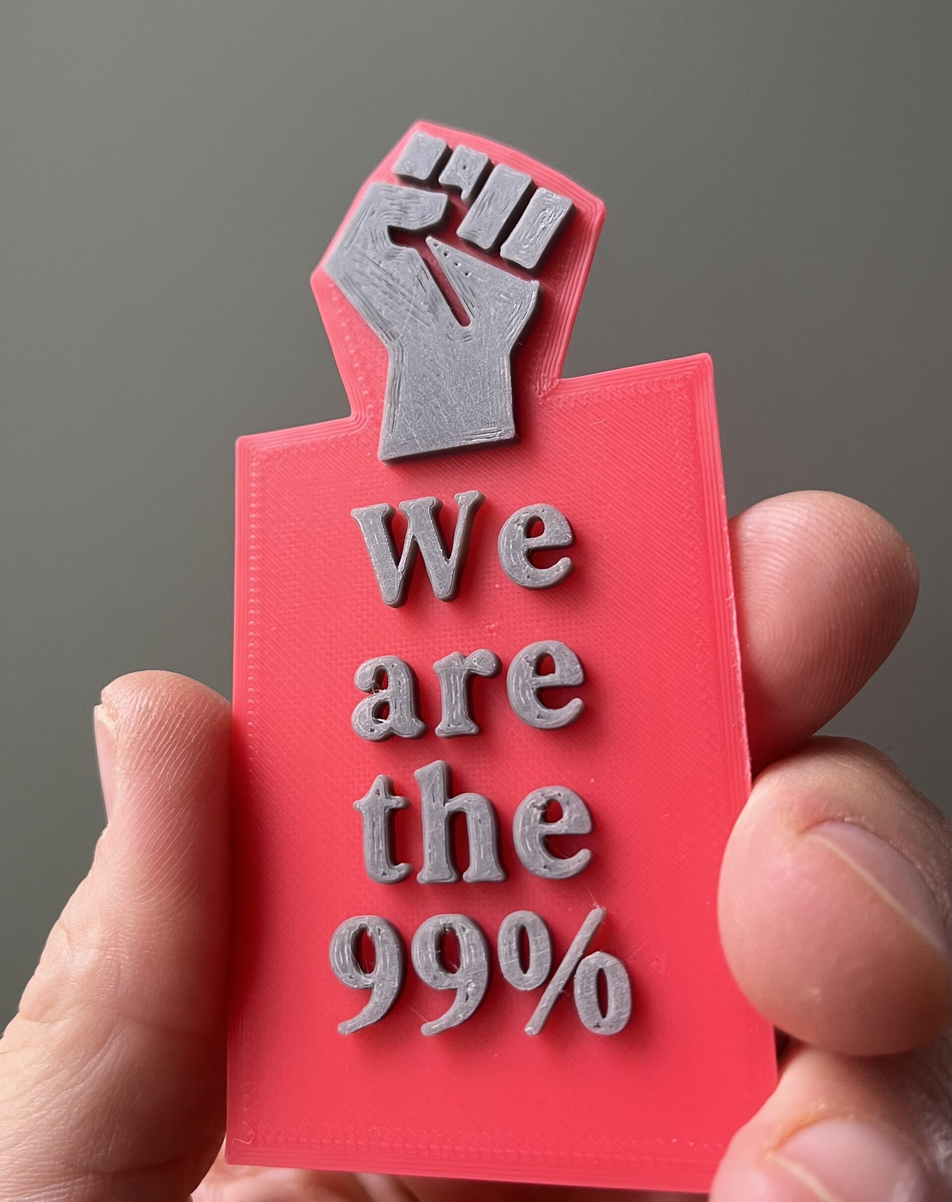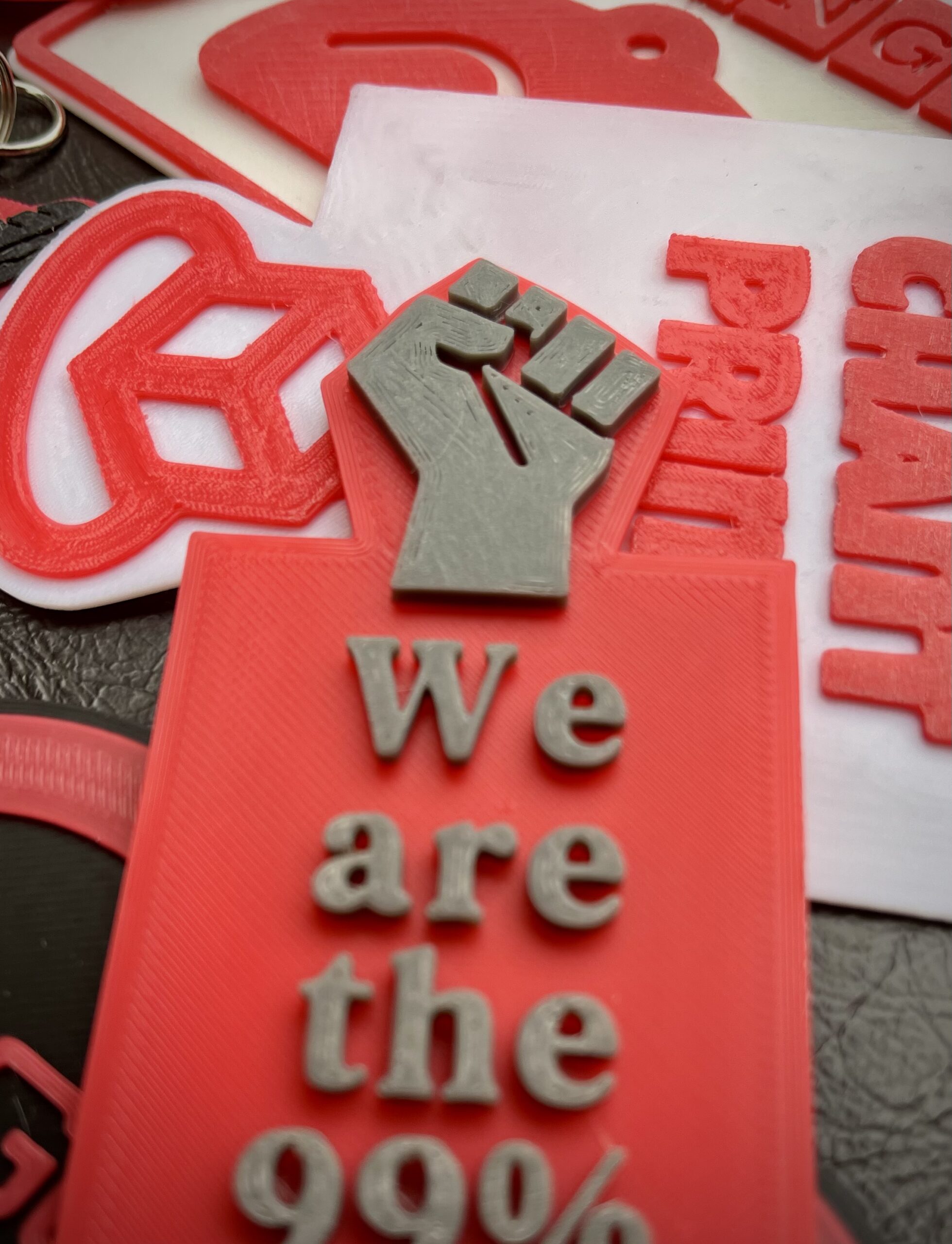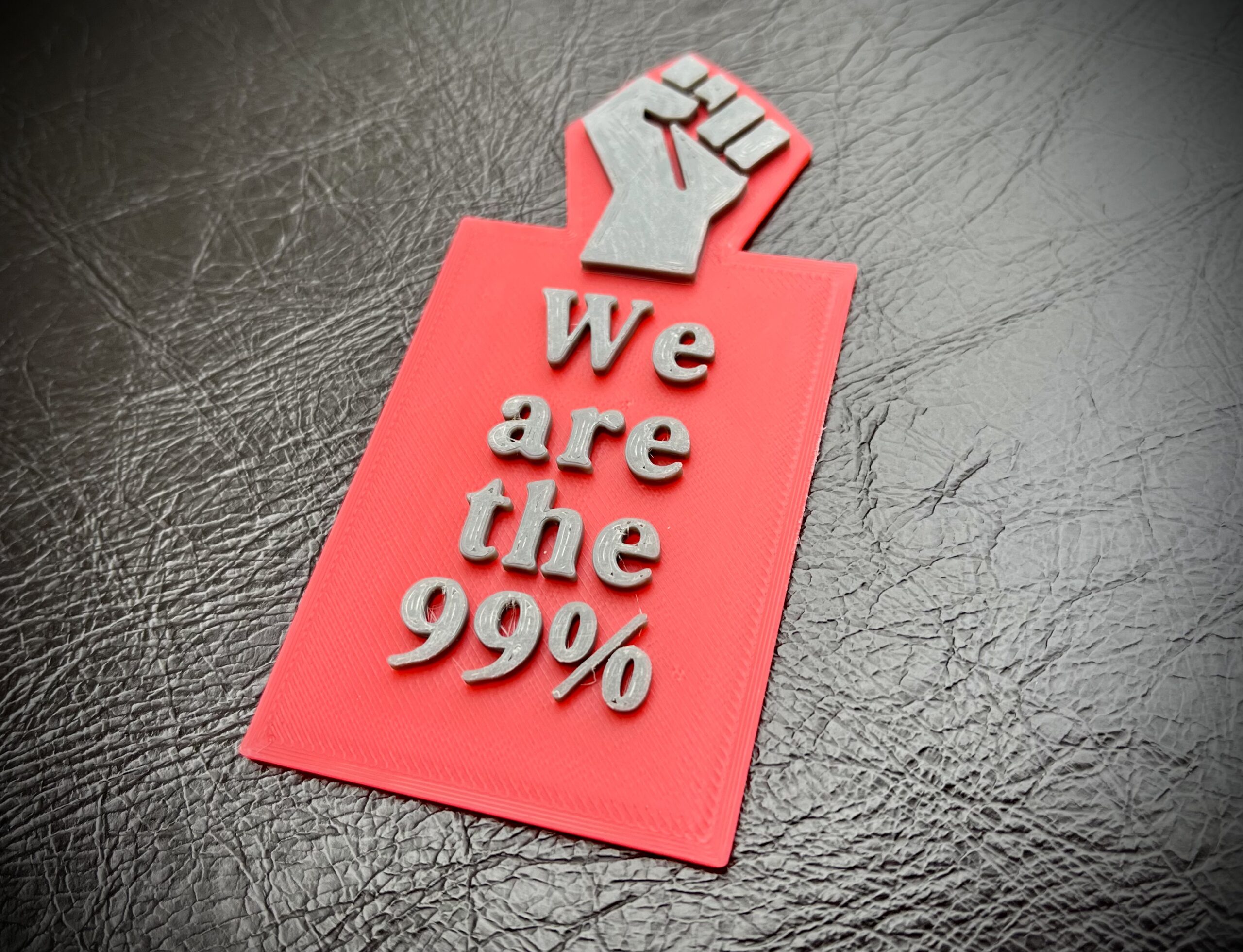 We are the 99% will be 3d-printed with attention to detail and an eye towards art. Each piece includes your choice of backing — a magnet or a built-in hanging slot — so you can display it wherever you like. The main material is PLA, which is biodegradable (in most conditions) and will work for years in regular indoor environments. Contact us to create the medallion with materials that will survive longer outside.